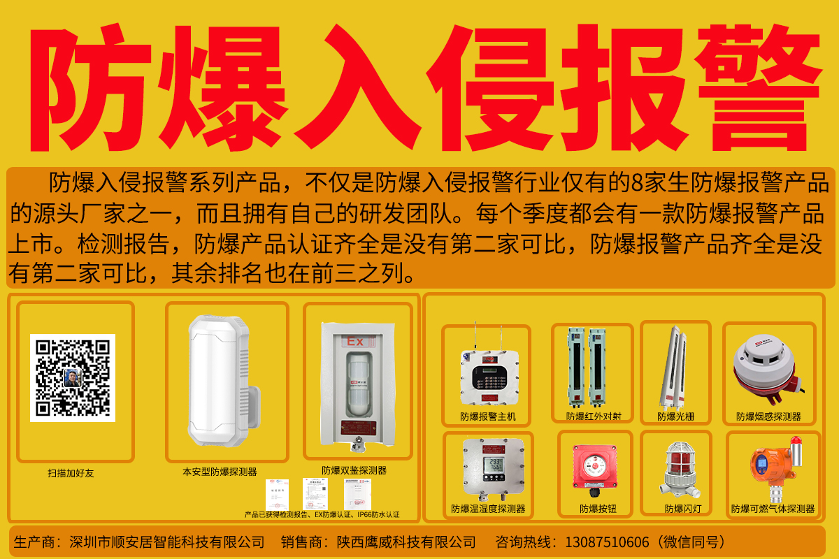 防爆入侵報警產(chǎn)品是為防爆區(qū)域入侵報警系統(tǒng)而設(shè)計的專用防爆入侵報警產(chǎn)品。陜西鷹威科技有限公司是一家集開發(fā)、生產(chǎn)、銷售為一體的生產(chǎn)防爆入侵報警產(chǎn)品的專業(yè)化生產(chǎn)廠家。作為防爆入侵報警產(chǎn)品生產(chǎn)廠家主要的產(chǎn)品系列有: