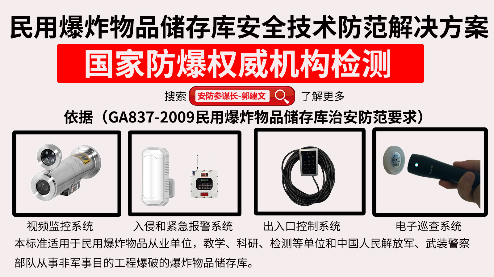 民用爆炸物品儲存庫,小型民用爆炸物品儲存庫,易制爆危險化學品儲存場所安全技術防范解決方案依據的規范性標準有哪些?除了通用的標準外,GA837-2009《民用爆炸物品存儲庫治安防范要求》、GA838-2009《小型民用爆炸物品儲存庫安全規范》、GA/T 848-2009《爆破作業單位民用爆炸物品儲存庫安全評價導則》三個公共安全行業標準。依據上述標準民用爆炸物品儲存庫,小型民用爆炸物品儲存庫,易制爆危險化學品儲存場所安全技術防范系統主要包括以下幾個子系統;入侵與緊急報警系統、視頻監控系統、出入口控制系統、電子巡查系統。危險化學品庫防爆防入侵系統、危化品倉防入侵報警系統、爆炸危險性化學品倉庫、危化品罐區防爆視頻監控系統、防爆入侵報警系統-防爆入侵報警系統批發價格、市場報價、廠家供應、易制爆危險化學品儲存場所安防系統改造招標可能大家就比較清楚了。