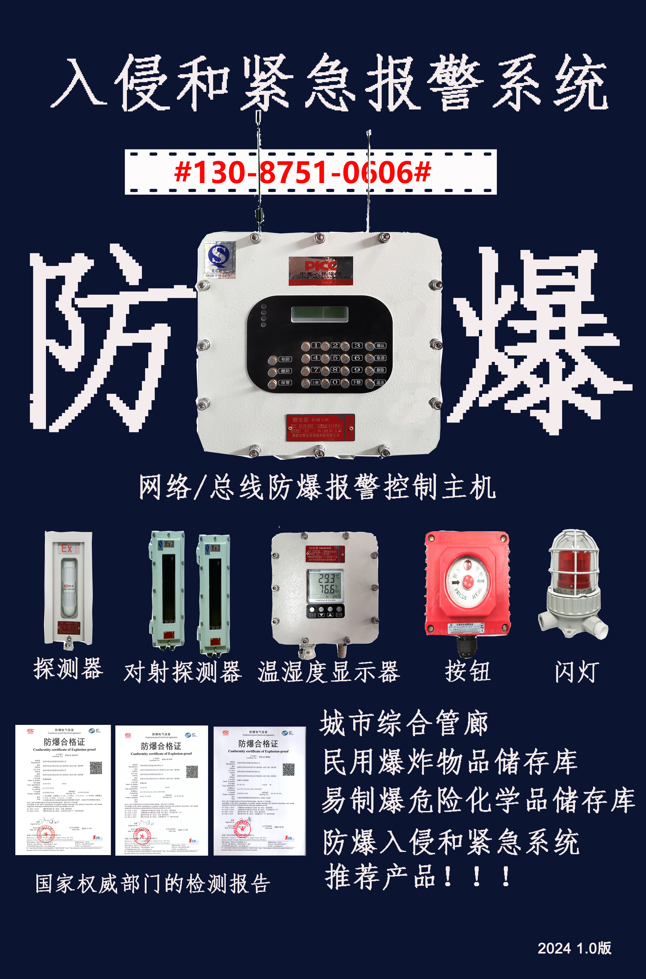 陜西鷹威科技有限公司是一家防爆入侵和緊急報警系統(tǒng)應(yīng)用場景解決方案提供商。公司提供的防爆入侵和緊急報警主要產(chǎn)品有:本安型紅外防爆探測器、防爆紅外微波雙鑒探測器、防爆紅外對射、防爆報警主機、防爆溫濕度探測器、防爆紅外多光束紅外光柵、防爆激光對射、防爆聲光報警器、防爆緊急按鈕、防爆控制箱等等。我們的產(chǎn)品防爆等級:ExdIICT6/IP65是目前行業(yè)內(nèi)最高等級,所有產(chǎn)品均已獲得深圳市計量質(zhì)量檢測研究院檢測報告和沈陽國家防爆電氣研究所的防爆合格證書和型式檢測報告。產(chǎn)品主要應(yīng)用于城市地下綜合管廊,危化品倉庫,國家物資儲備庫,軍隊彈藥庫,大學(xué)危化品實驗室等場所。